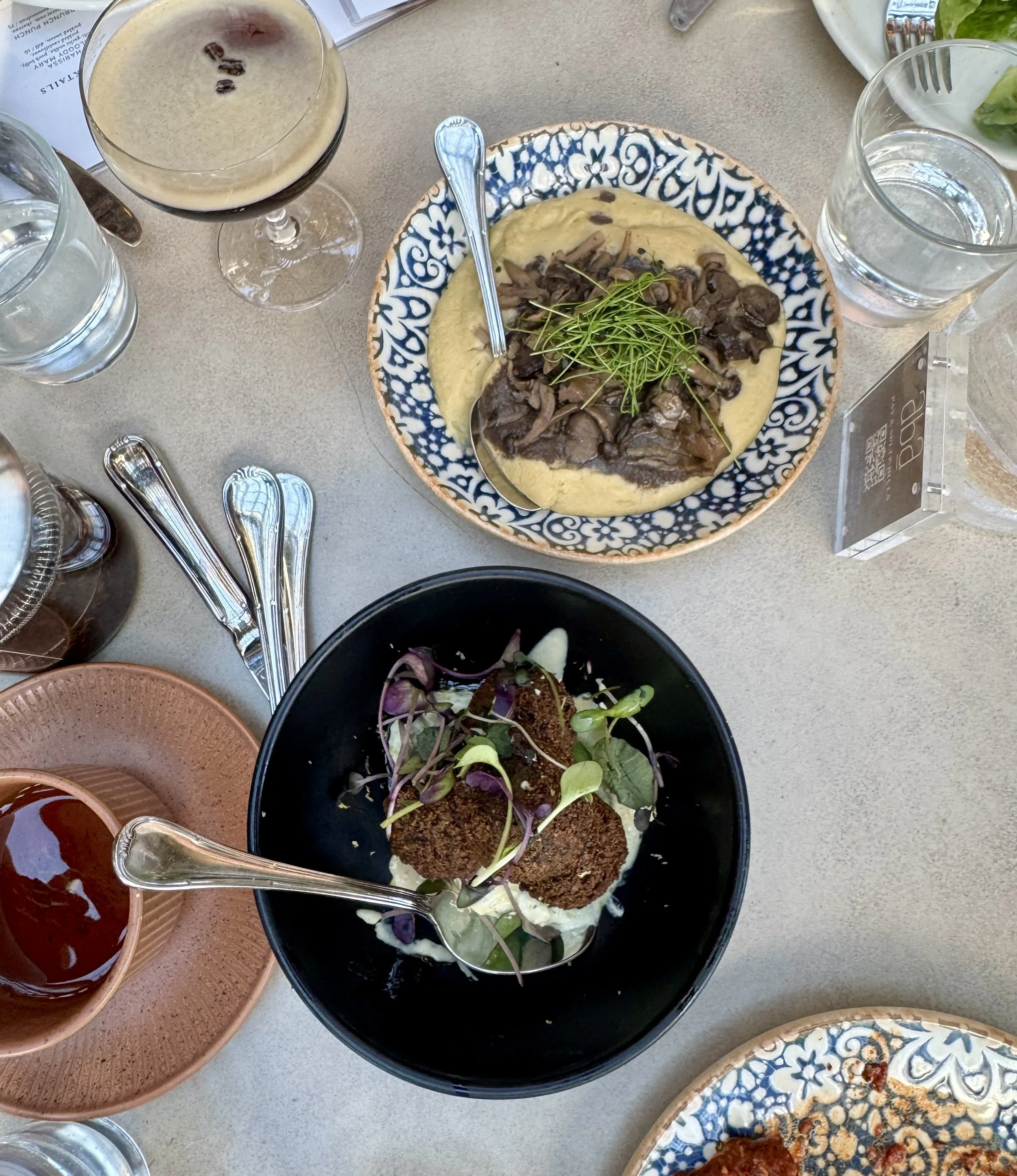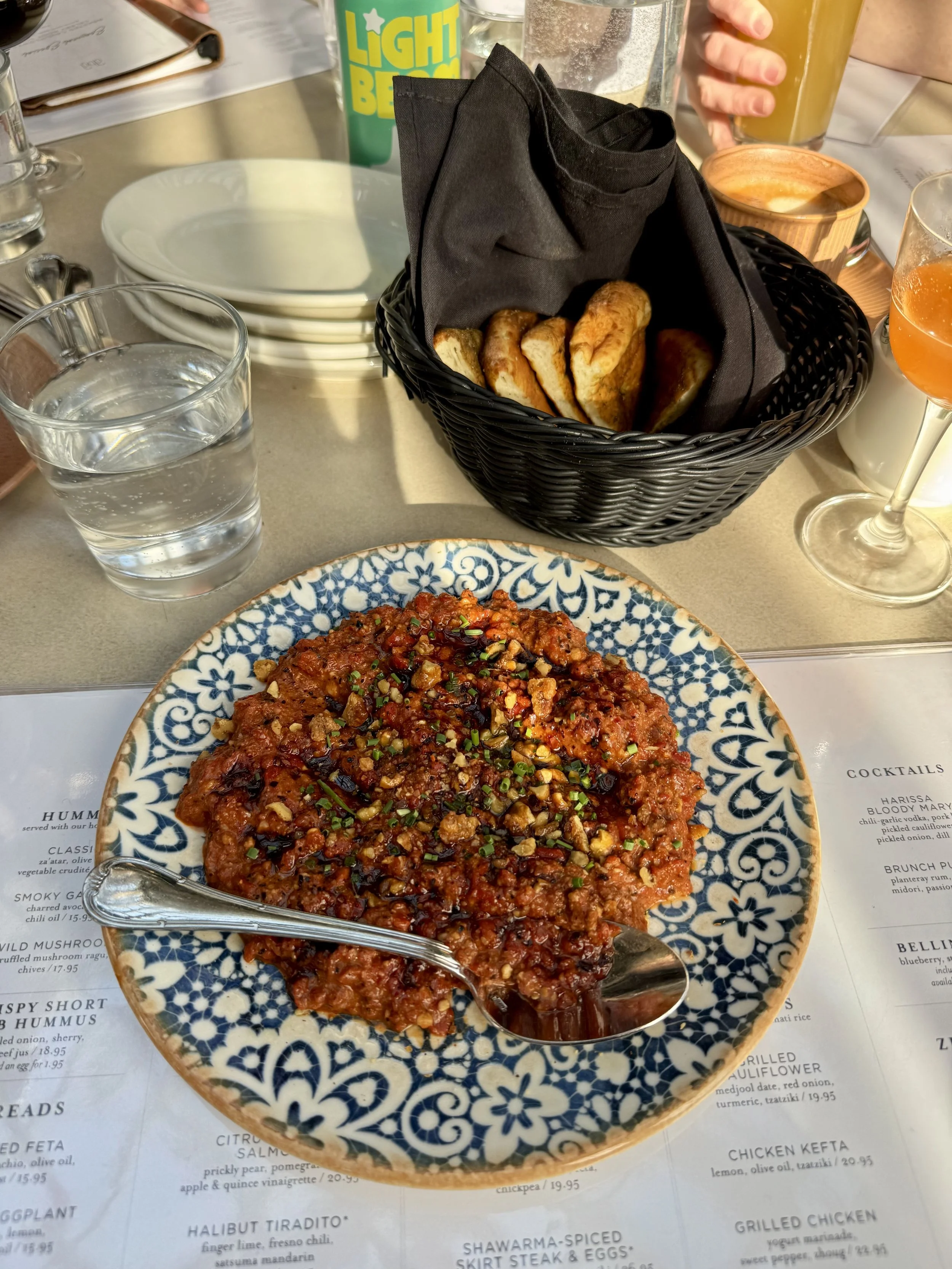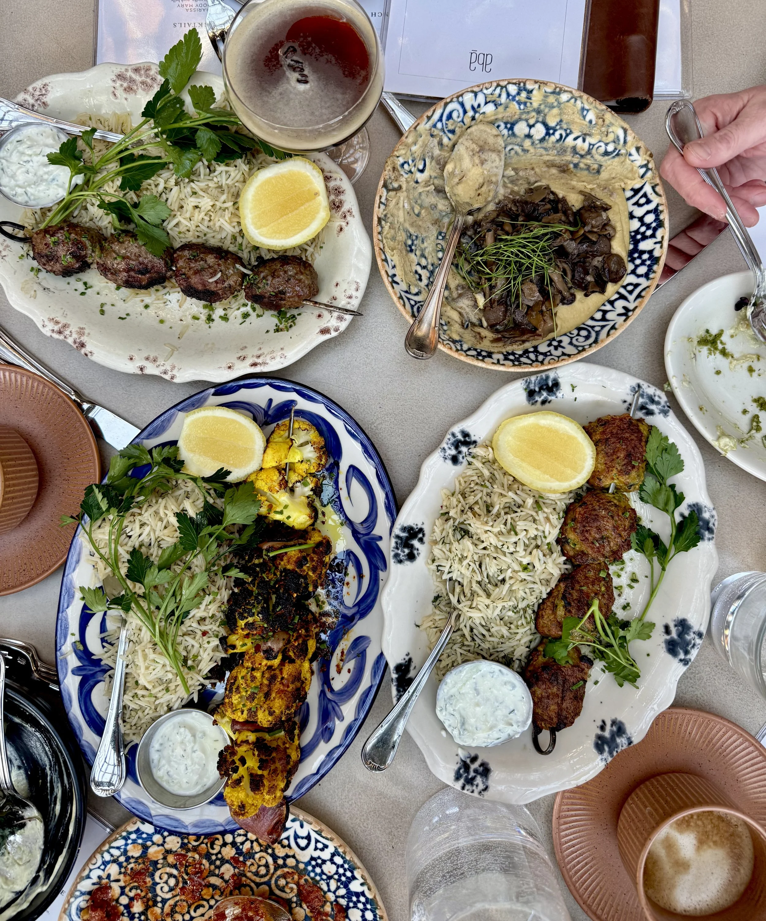 Aba is all about shareable plates, which made the experience even more fun. We enjoyed two types of hummus—the classic and the wild mushroom—both silky smooth and served with warm, house-made pita. We also tried the Muhammara (roasted red pepper, isot chili, walnut, and pomegranate molasses), which was so good. From there, we added green falafel, grilled cauliflower, and three kinds of kebabs served with the most delicious basmati rice—wow. I’d never had basmati rice before, and it’s officially a winner in my book!