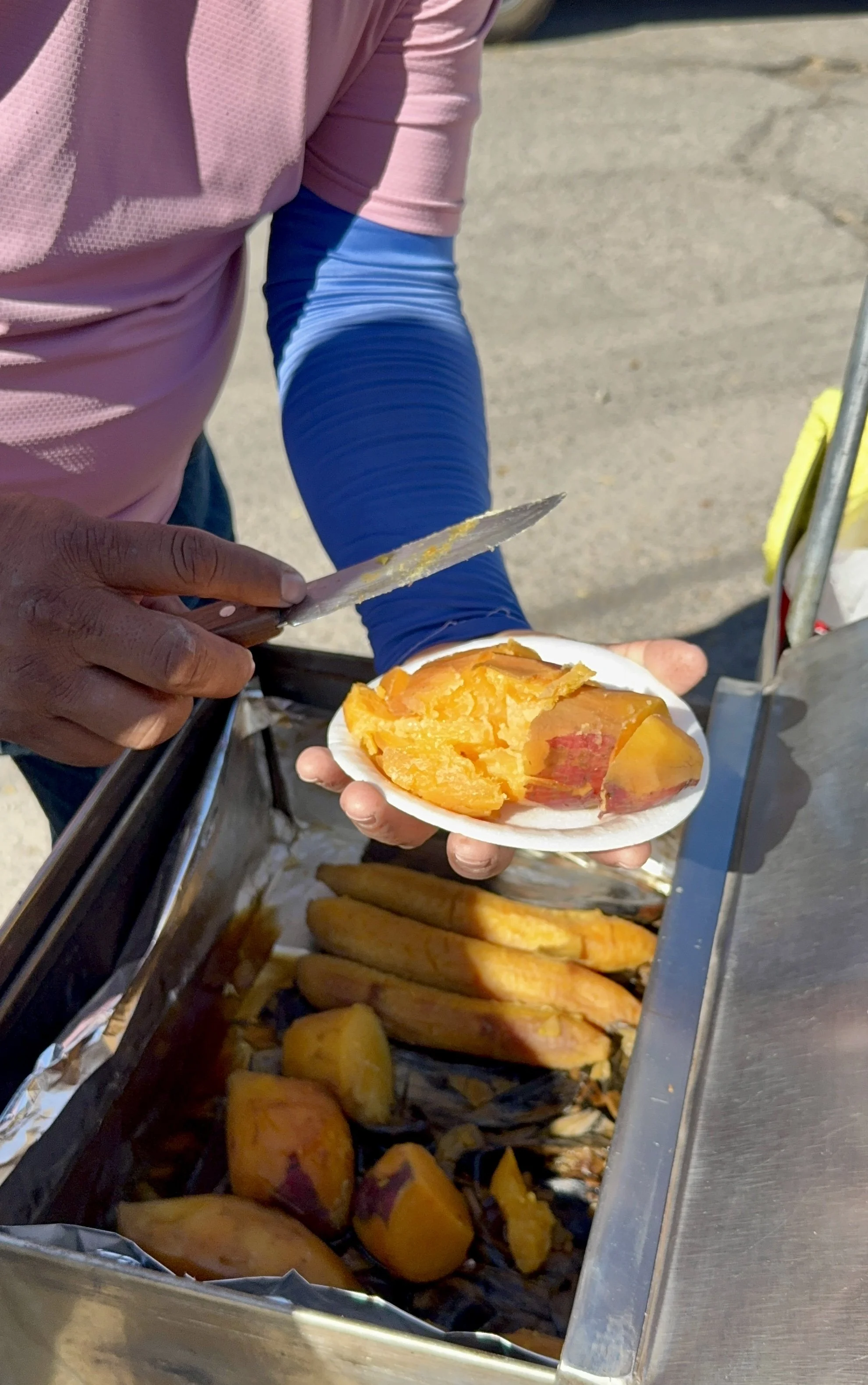 A street vendor passed through my mom’s neighborhood selling baked sweet potatoes with delicious toppings. Of course, I had to stop him and get some—so good!!!