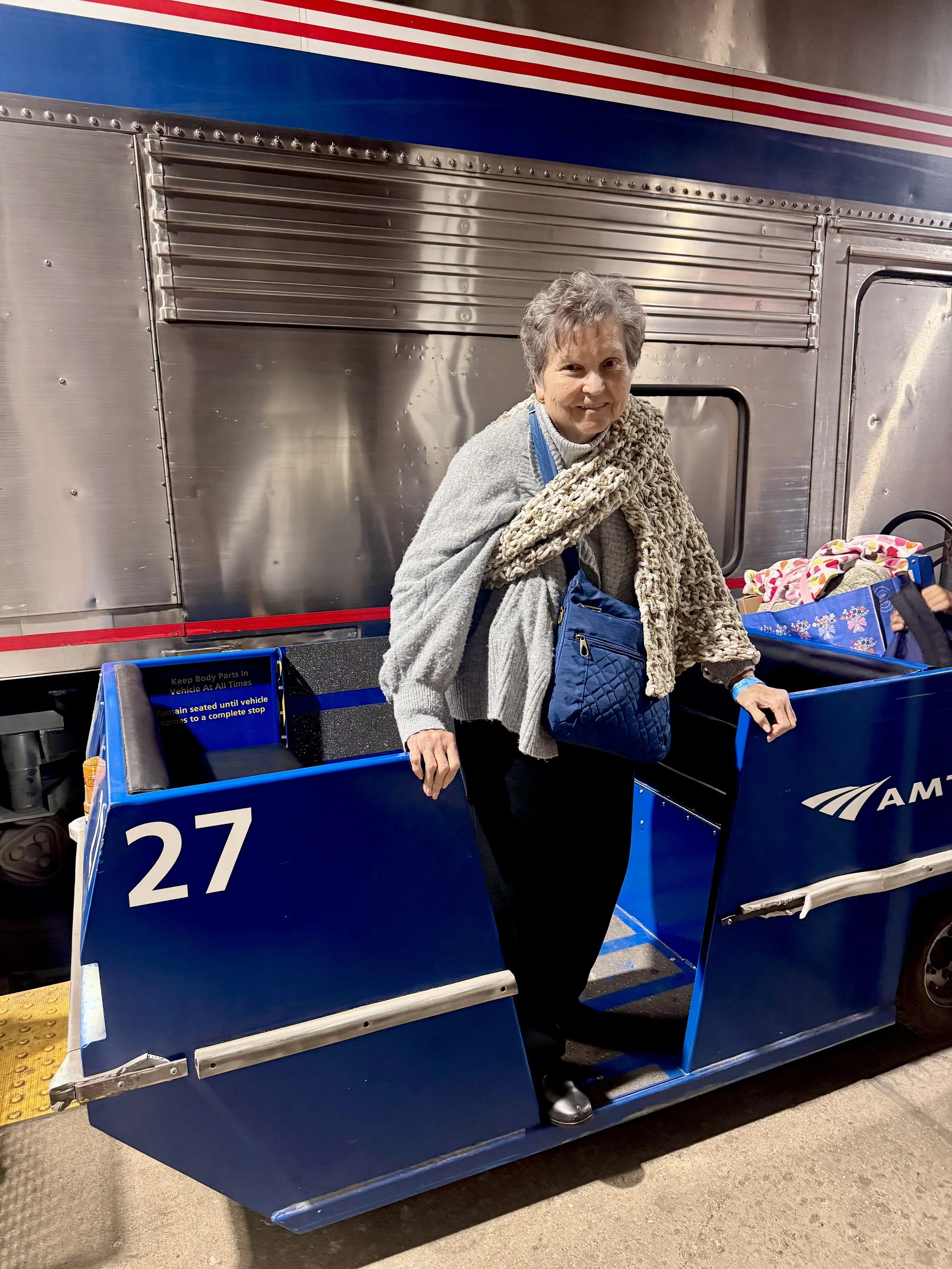 Cuando llegó la hora de abordar, vino el caos. La “asistencia” que habíamos solicitado se convirtió en confusión, filas, instrucciones apresuradas y un “paseo” en un tipo carro de golf que me obligó a levantar, empujar, cargar y sostener absolutamente todo —incluida a mi mamá. Los adultos mayores a nuestro alrededor se veían estresados y abrumados. En medio de todo, se me cayó y se rompió su botella de agua… y casi también mi cordura.