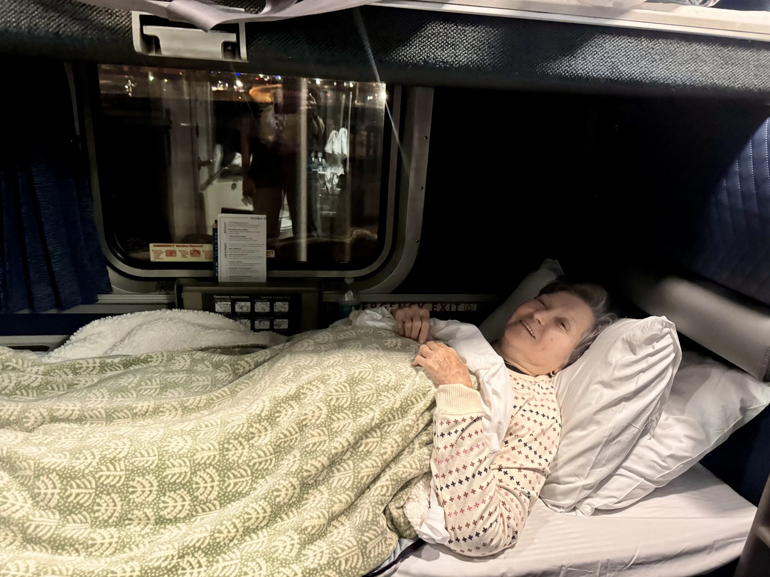 Cuando compré los boletos, me aseguré de que viajáramos en un camarote y no en clase turista. Mi mamá jamás habría podido soportar un viaje tan largo en asientos normales, y mucho menos estar caminando de un lado a otro hasta el baño cada vez que lo necesitara. Por fortuna, casi al último momento, logramos conseguir un camarote accesible en el nivel inferior del tren.