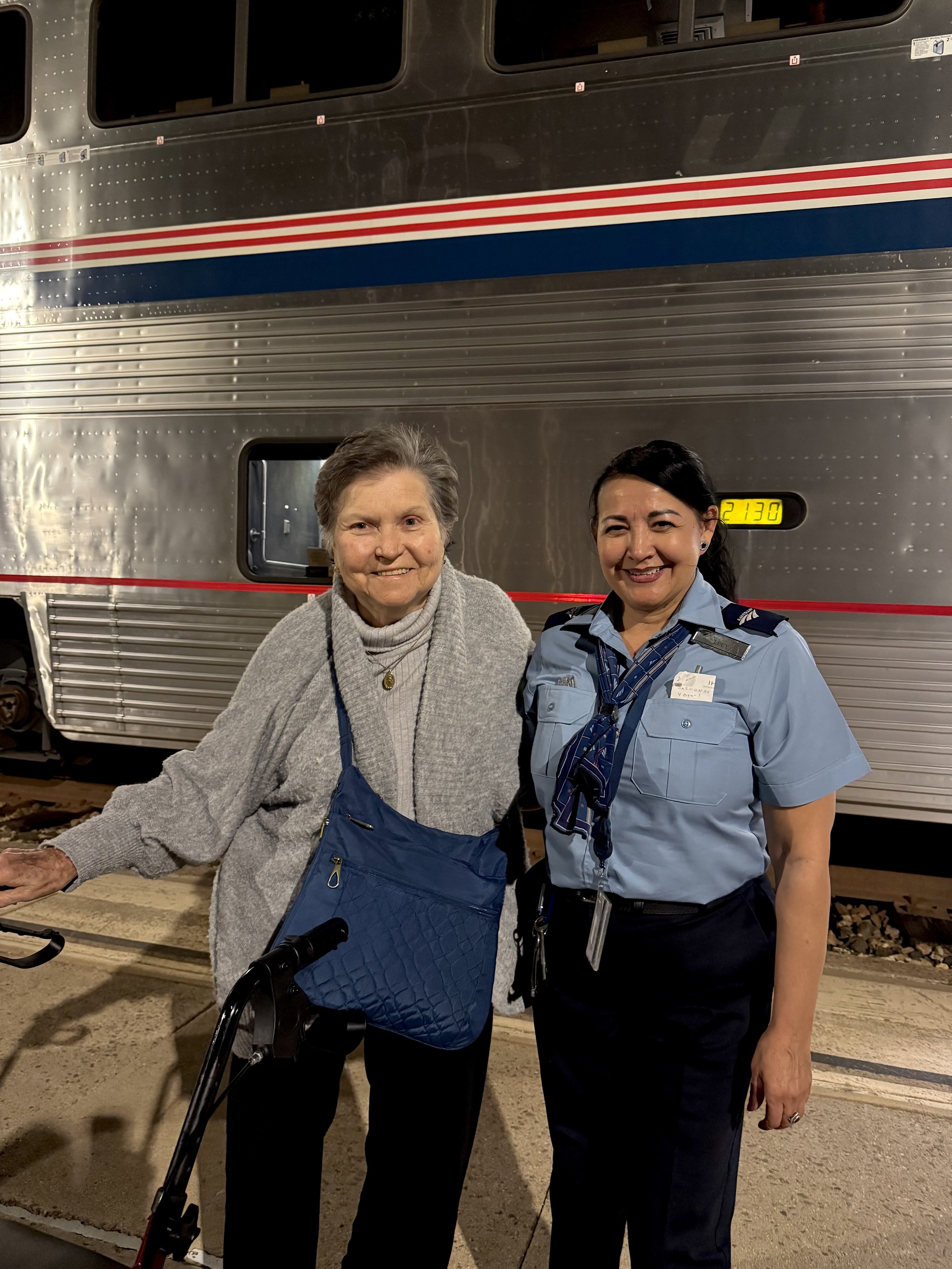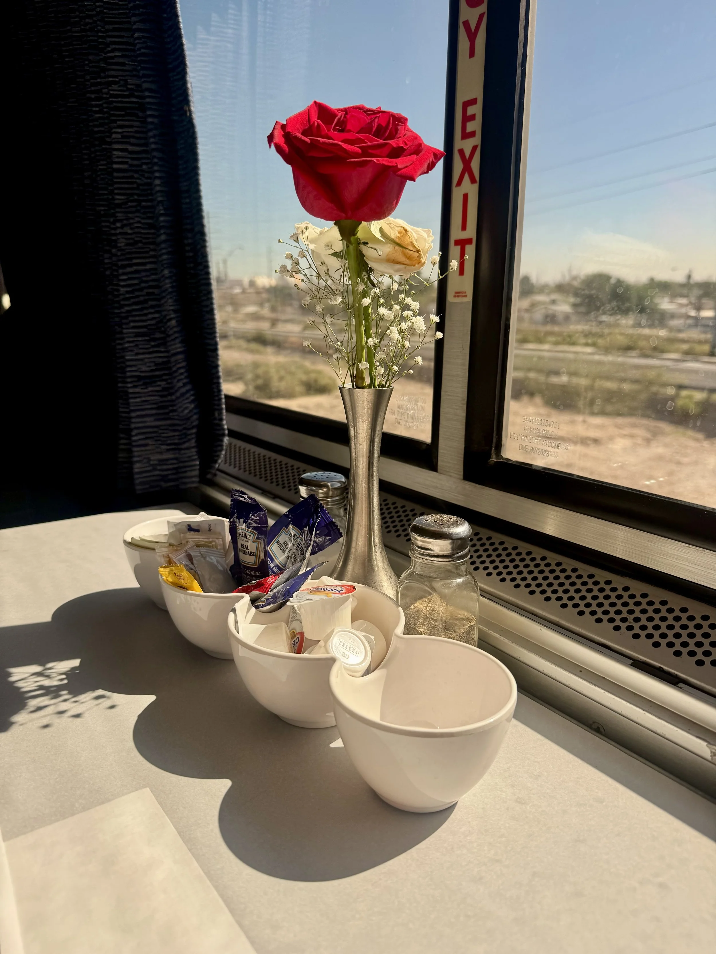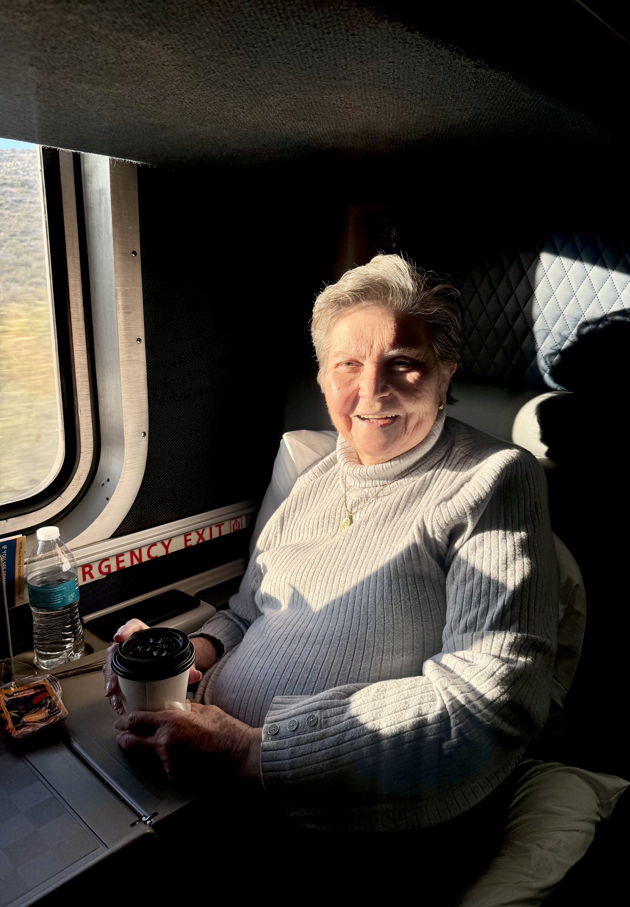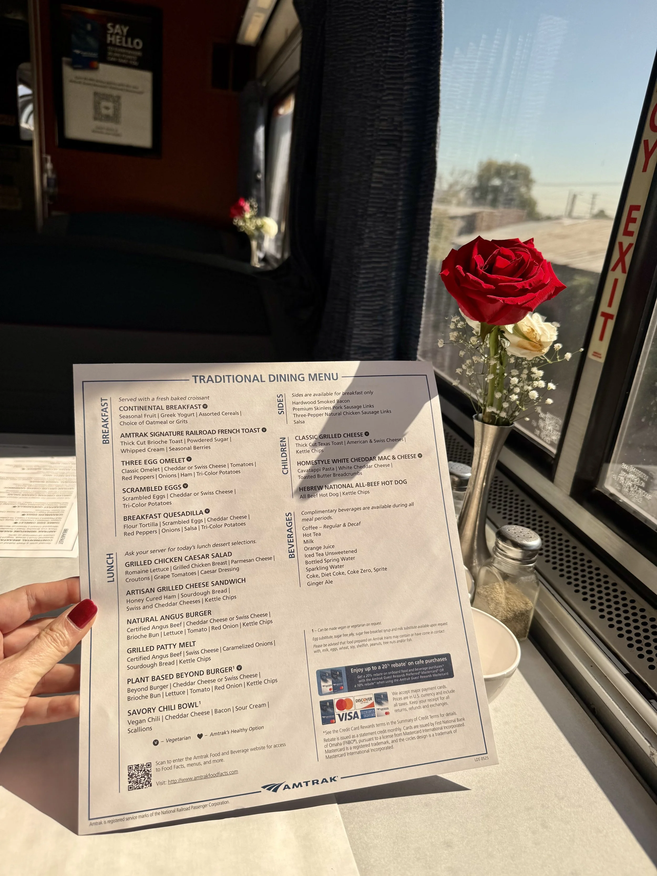 Esa noche compartí la mesa del comedor con un padre y su hijo que viajaban desde la India. La esposa del papá acababa de fallecer recientemente de manera repentina y se enfermó mientras visitaba a sus hijos en Texas. Sin poder volar, recurrieron a Amtrak — igual que nosotros. La vida tiene una forma de reflejarnos nuestras propias historias.
